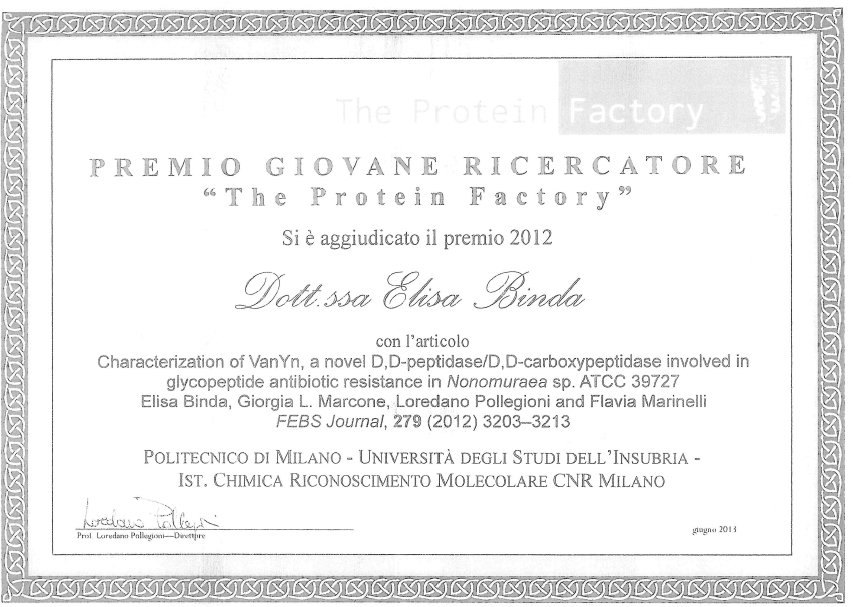 - Award Young Researcher 2013 “The Protein Factory” (to Elisa Binda).